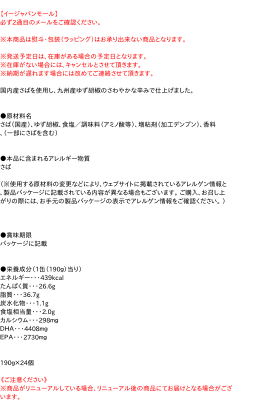 ) ●賞味期限 パッケージに記載 ●栄養成分(1缶(190g)当り) エネルギー・・・439kcal たんぱく質・・・26.6g 脂質・・・36.7g 炭水化物・・・1.1g 食塩相当量・・・2.0g カルシウム・・・298mg DHA・・・4408mg EPA・・・2730mg 190g×24個【メーカー・製造または販売元】株式会社宝幸0120-020537【広告文責】株式会社イージャパンアンドカンパニーズ 072-875-6666《ご注意ください》 ※商品がリニューアルしている場合、リニューアル後の商品にてお届けとなる場合がございます。